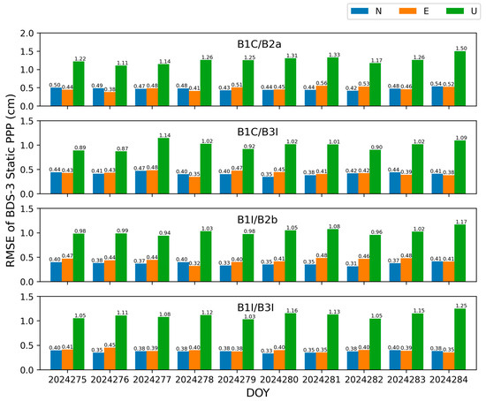 The daily root mean square error (RMSE) obtained from the static PPP runs of the 60 stations over the period from DOY 275 to DOY 284 in 2024 utilizing BDS-3 and Galileo signals are shown in Figure 2 and Figure 3. The results in Figure 2 and Figure 3 are presented in two decimal places for ease of presentation. The bars are the mean RMSE over all 60 stations for 1 day in Figure 2 and Figure 3.