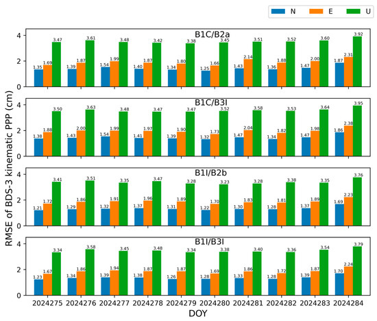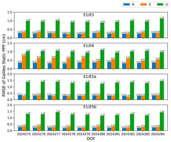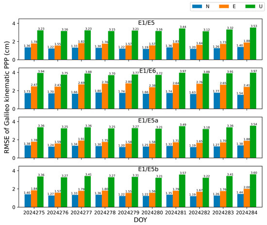 The time series of the average RMSEs for the 60 stations, covering the period from DOY 275 to DOY 284 in 2024 and calculated from BDS-3 and Galileo signals in kinematic mode, are shown in Figure 6 and Figure 7. The results in Figure 6 and Figure 7 are presented in two decimal places for ease of presentation. The bars are the mean RMSE over all 60 stations for 1 day in Figure 6 and Figure 7.