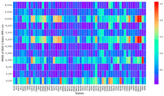 To present the results of the experiment with more detail, the RMSEs of the static PPP results for BDS-3 and Galileo at each station are shown in Figure 4 and Figure 5, respectively. The sequences of the station names on the horizontal axes of Figure 4 and Figure 5 are arranged alphabetically, and the vertical axis represents different linear combinations.