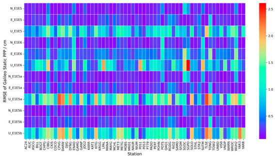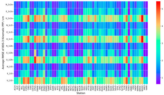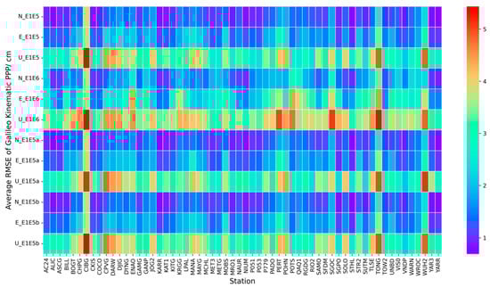 To present the results of the experiment, the RMSEs of the kinematic PPP results for BDS-3 and Galileo at each station are shown in Figure 8 and Figure 9, respectively.