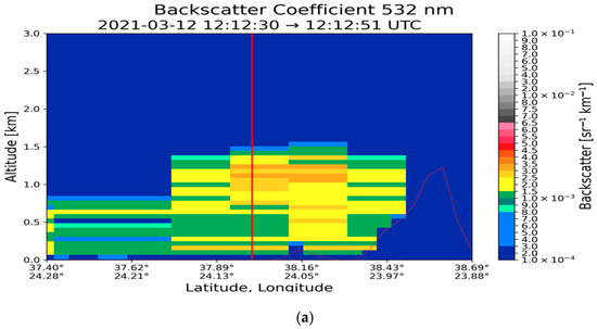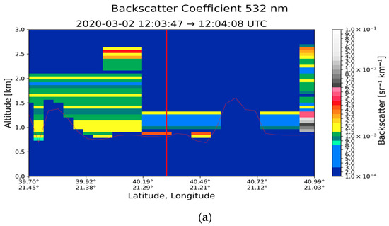 Three study periods were analyzed, one for Athens during the spring of 2021, and two for Thessaloniki during the spring of 2019 and 2020. Cases with a total pollen concentration greater than 400 grains m−3 for at least two hours per day were considered severe pollen events, and those that coincided with CALIPSO overpassing in a distance lower than 180 km were selected for analysis. The number of CALIPSO overpasses with the applied pollen criteria described above was 7 for Athens and 17 for Thessaloniki. From these cases, 3 of Athens and 7 of Thessaloniki were excluded due to clouds. One case in Athens was also omitted due to insufficient CALIPSO data.