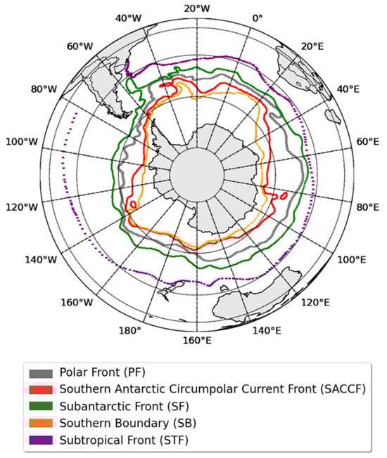 Southern Ocean regions. The study area is located in the Atlantic sector of the Southern Ocean. The isolines illustrate the circumpolar oceanic fronts from south to north, and they are the Southern Boundary (SB), the Southern Antarctic Circumpolar Current Front (SACCF), the Polar Front (PF), and the Subantarctic Front (SF). To the north of the SAF is the Subtropical Front (STF) [].