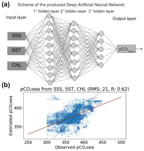 (a) Scheme of the produced Deep Artificial Neural Network. The input data are sea surface salinity (SSS), sea surface temperature (SST) (°C), and chlorophyll-a concentration (CHL) (mg·m−3) (μatm). The ANN includes 3 hidden layers with 10, 8, and 5 nodes. The output layer gives the seawater partial pressure of CO2 (pCO2sea) (μatm). (b) Pearson correlation between pCO2sea estimates using SSS, SST, and Chl as ANN input data. Scatterplots and regression lines were calculated from Test data (with 15% of the data set).