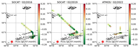 CO2 fluxes in gC m−2 month−1 distribution at Drake Passage with SOCAT data for February 2016 and 2019, and with ATMOS data for February 2022.