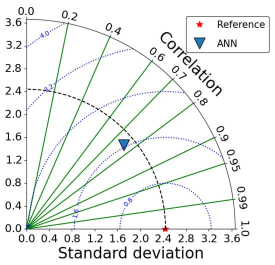 Taylor diagram for comparison between the FCO2 calculated with in situ data (Reference) and from the ANN pCO2sea reconstruction (ANN). The blue lines are the root mean square (RMS) error.