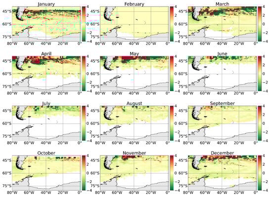 In summer, absorption is more intense than in other seasons (Figure 5), with 72% more absorption than in autumn and winter, and 51% more than in the southern spring. The absorption peak occurs mainly in February; this is due, in part, to the reduction in surface salinity caused by the seasonal melting of sea ice, which makes the ocean more soluble. The lowest absorption values are mainly in August due to increased salinity from the release of salt during the formation of sea ice and high-density water that will sink with the CO2-rich waters. The expansion of sea ice cover occurs in autumn and winter, with maximum extension in August and September. Also, during this period, the ocean can even become a source of CO2 for the atmosphere, caused by high salinity values at the surface that cause a reduction in the solubility of CO2 in the ocean [,]. The ice cover can extend from the Antarctic continent to 55° S in the Atlantic sector in some years; however, on average it can extend up to 62° S in winter []. As winter progresses, ice formation increases, releasing salts, which can contribute to the release of CO2 into the water. The layer of mixed water under the ice is rich in CO2, mainly due to the vertical mixing of deep waters [,]. However, in the summer and spring the ice cover melts and reaches its minimum size in February, which is why this is the month in which the greatest absorption of CO2 occurs []. Furthermore, in the southern summer and spring there is an increase in light availability and stable stratification of surface water, which allows an increase in primary biological productivity, which leads to an increase in CO2 absorption during these seasons [,,].