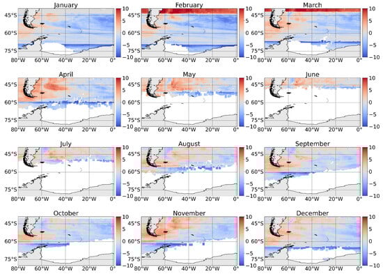The SST anomaly maps produced using reanalysis data, shown in Figure 6, illustrate that some regions of the study area are becoming increasingly warmer over time, which affects FCO2. The waters coming from the Pacific Ocean through the Drake Passage to the Atlantic sector of the Southern Ocean are releasing more CO2 than the expected average (Figure 5). These are the waters from the PF. The PF is located approximately at latitude 50° S in the Atlantic and at latitude 60° S in the Pacific. This is a region where CO2 is released, due to its average surface temperature being higher than that south of this region. This behavior was also observed with SOCAT and ATMOS data as shown in Figure 3. The surface water south of this region moves northwards and sinks when it reaches the PF, thus causing convergence at the surface []. However, with the increase in SST, the PF shows stronger CO2 outgassing. To the north of the PF there is an increase in CO2 release; this region has higher temperatures, due to the dominant effect of seasonal SST changes []. However, to the south of the PF there is an increase in CO2 absorption. In this region, the surface waters of the Antarctic Zone have very low temperatures, reaching values close to the freezing point (−1.9 °C), as a result of the summer melting of the sea ice and surface cooling in winter []. Below the surface in the Antarctic Zone, extending up to 4000 m deep, is the Antarctic Circumpolar Water (AACW), with temperatures of 1.5 to 2.5 °C []. Close to the coast of the Antarctic continent, some regions also intensified the release of CO2. Despite being a region with a higher potential temperature than at the shelf break, the SST was also warmer. This region is where the Deep Circumpolar Water rises over the slope to enter the platform, as it has warmer and saline waters []. However, the waters that are a source of CO2 are expanding southward, and the waters that are sinks of CO2 become stronger sinks. This is due to the increase in strength and southward displacement of the westerly winds, associated with the positive trend in the AO, which forces the migration of the FS towards the Antarctic continent, thus migrating warm and saline waters, which cause the release of CO2. This trend towards the positive phase of OA is due to the increase in greenhouse gases [,,].