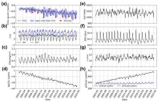 The physical pumping of CO2 from the atmosphere to the ocean is associated with the solubility of CO2 in water, which is influenced by changes in temperature, salinity, and atmospheric pressure, in addition to the action of winds, since wind speed influences absorption []. Thus, it was possible to observe the variation in FCO2 because of changes in the variables used in this study. There is a tendency towards negative CO2 values throughout the period studied (Figure 7a), with peaks and decreasing values, which follows the seasonality of the SST (Figure 7b). The SLP varies inversely to the temperature, that is, when the temperature increases the SLP decreases and vice versa (Figure 7b,e). Furthermore, the SLP appears to be inversely proportional to the FCO2, so it is possible to observe that where there is a drop in the SLP, there is an increase in the values of FCO2, which become more positive (Figure 7e). This relationship between SLP and FCO2 indicates a decrease in the concentration of atmospheric CO2 near the surface and, consequently, there is a tendency to transfer CO2 from the ocean to the atmosphere. Wind speed is strongest in the months of March to November, ranging from 11 to 13 (m/s), and reduces in the months of December to February (southern summer), ranging from 9 to 10 (m/s) (Figure 7g). Biological CO2 pumping is carried out by photosynthetic activity, and the analysis in this study was based on CHL, which varies seasonally. CHL blooms occur during the austral spring–summer and decrease in the austral autumn–winter (Figure 7c). The months of August and September have the lowest concentrations of CHL.