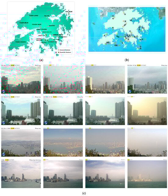 (a) Location of the monitoring stations in Hong Kong (www.hko.gov.hk accessed on 11 November 2024). (b) Location of the weather cameras in Hong Kong (www.hko.gov.hk accessed on 11 November 2024). (c) Sample input images (www.hko.gov.hk accessed on 1 November 2023).