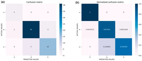 (a) Confusion matrix for prediction accuracy. (b) Normalised confusion matrix for prediction accuracy.