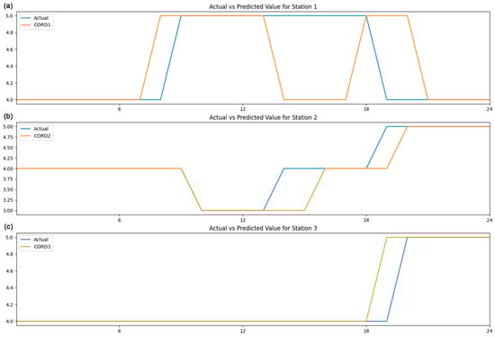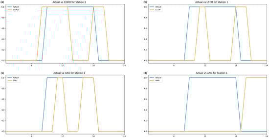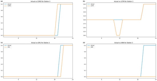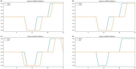 The coefficient of determination, denoted as R2, is conventionally utilised to evaluate the proportion of variance explained by a model in the context of continuous outcomes. A comprehensive summary of the R² values associated with each algorithm has been meticulously compiled and is presented in the table (Table 2) above. At Station 1, the R² values for all models are markedly inferior in comparison to those at other stations. For example, the CORD model demonstrates an R2 of 0.15, the LSTM model displays an R² of 0.04, and the GRU model indicates an R2 of 0.37. These low R2 values suggest that the models account for only a minor fraction of the data variance at Station 1. However, this observation does not necessarily imply inadequate model performance, as the rounding of data results in discrete values that attenuate the variability of the target variable, thereby rendering R2 less relevant as a performance metric. In contrast, at Stations 2 and 3, significantly higher R2 values are apparent for the majority of models, particularly for CORD, which records R2 values of 0.77 and 0.79, respectively. Considering that the target data are rounded, the relationship between predicted and actual values is overly simplistic, potentially inflating the R2 values and engendering a misleading interpretation of model efficacy. Furthermore, the ANN model produces “Infinity” values for R2 at Stations 2 and 3. This phenomenon occurs when the total variance of the rounded target data (the denominator in the R2 calculation) is either zero or exceedingly minimal, resulting in division by zero. This observation highlights the shortcomings of R2 for datasets characterised by rounding, as it fails to provide a meaningful evaluation of model performance.
