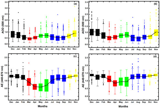 | AOD (500 nm) | 0.67 ± 0.01 | 0.0056776 | 18.62 | 0.001 | 0.72 ± 0.23 | 0.0123218 | 28.93 | 0.002 |