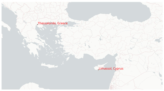 A map of the Eastern Mediterranean coastal region, with Thessaloniki, Greece, and Limassol, Cyprus, labelled.