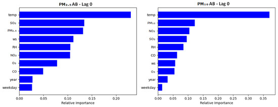 The three most important features for each city were the same when separated by particulate matter granularity, despite each city having different best-performing models (AB in Thessaloniki and RF in Limassol). The PM2.5 models for both cities saw temperature, SO2, and PM2.5 as their most important features, while the PM10 models for both cities saw temperature, NO2, and PM10 as most important instead. The lowest individual relative importance was seen in the ‘weekday’ and ‘year’ variables, which yielded the lowest importance across every model in each city by a considerable margin. Specifically, in Figure 2 and Figure 3, weekday had a mean importance of 0.039 and year had a mean importance of 0.033, compared to the mean importance of features excluding weekday and year, which was 0.127.