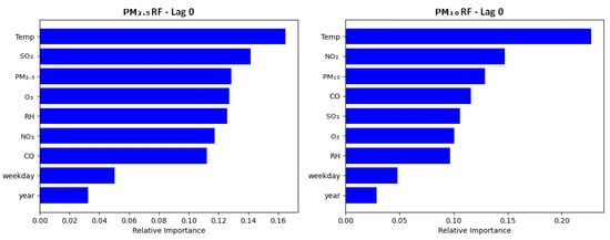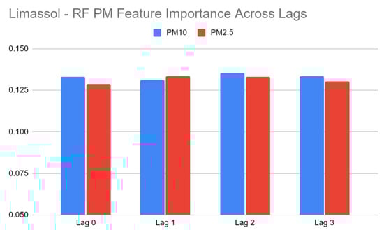 Comparatively, Limassol’s RF models saw a minor change in the feature importance of PM2.5 or PM10 across lags. PM2.5 saw its highest importance at a lag of 1 day, but only slightly, whereas PM10 saw its highest importance at a lag of 2 days; however, this was an almost negligible increase. It is noted that although models may have performed better at longer lags, this was not necessarily always linked to a linear increase in their importance, as other predictive variables saw some greater importance at longer lags. The full variable set of importance graphs across lags are illustrated in Figures S2–S5.
