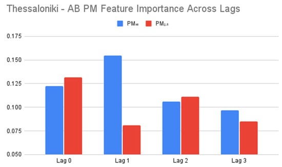 The change in the particulate matter variable’s feature importance across lags varied by city. Thessaloniki’s AB models saw variable changes in feature importance across lags for PM2.5 and PM10. While PM2.5′s importance plummeted for a lag of 1 day and slightly recovered for the higher lags, PM10′s importance spiked at a lag of 1 day, before slowly tapering off for the remaining two lags.