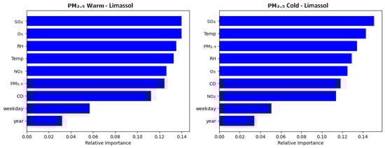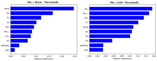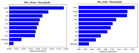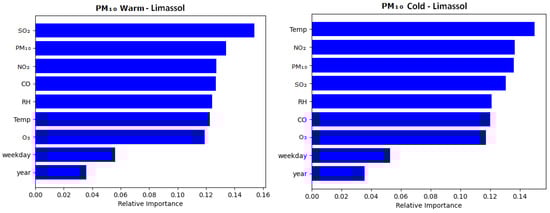The separation of the PM2.5 and PM10 models into distinct warm season and cold season variants resulted in seeing a large decrease in temperature’s relative importance as a predictor variable, in comparison to the mixed seasonal models. The PM2.5 and PM10 models for Thessaloniki, as well as the PM2.5 models for Limassol, demonstrated a heightened relative importance of their respective particulate matter variable in the cold season models compared to the warm season models, with the exception of Limassol’s PM10 model, which deviated from this trend. The lowest individual relative importance was seen in the ‘weekday’ and ‘year’ variables, which consistently yielded the lowest importance across every model in each city by a considerable margin. Specifically, in Figure 6, Figure 7, Figure 8 and Figure 9, weekday showed a mean importance of 0.044 and year had a mean importance of 0.031 compared to the remaining features’ mean of 0.123.