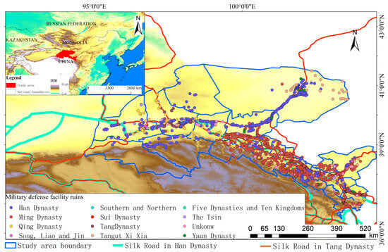 The Hexi Corridor in Gansu, China, constituted a relatively independent geographical unit, connecting the Guanlong region in the east, the Western Regions in the west, the Hehuang region in the south, and the Huns and Mongolia in the north. The Hexi Corridor was characterized by its extensive distribution of interfluvial valleys and vast oases, presenting a diverse and complex natural environment. The terrain gradually descended from east to west, with elevations ranging between 1000 and 2000 meters above sea level. The climate typically followed a temperate continental arid pattern, where annual precipitation remained scarce and was predominantly concentrated during summer months. The Qilian Mountains served as the primary water source, with rivers such as the Heihe, Shule, and Shiyang originating from this range and flowing through the corridor. This landscape supported both fertile oasis farmlands suitable for cultivation and expansive grasslands ideal for pastoral grazing, establishing the region as a convergence zone where the Central Plains’ agricultural civilization and northern nomadic pastoralist cultures intersected. The area witnessed continuous interactions and conflicts between these two distinct civilizational patterns throughout historical periods. Therefore, it has repeatedly been designated as an important military site (Figure 1). The Central Plains Dynasty and the northern tribes have long competed for its control. During historical periods, the Hexi Corridor area was the most important military defense in the Northwest region. It played a pivotal role in guarding the Silk Road, resisting harassment by northern nomads, blocking incursions from the Northwest, and stabilizing the Central Plains. Therefore, after the Han Dynasty opened the Western Regions and established the four prefectures in Hexi, successive dynasties in the Corridor established a series of military management systems such as the Hexi, Juyan, and Gansu Town Garrison Zones, the Anxi Dufu, and the Hexi Jiedushi [22,23]. These zones gradually formed a complete military defense system. The construction of the military defense system was complete and orderly. It was representative of the military defense system in ancient northern China. Furthermore, it has become an ideal area for research.