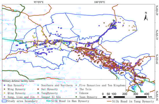 This paper collects and records the locations, attributes, and geographical environment information of military ruins, buildings, facilities, city sites, walls, and towers (categories of cultural relics) in the Hexi Corridor from the Han to the Qing Dynasty (221 BC–1912 AD). The facilities include city sites, beacons, enemy and pier towers, side walls, barrier sites, forts, post stations, trenches, and other archaeological ruins. For the first time, a dataset of ancient military sites has been compiled. It covers the entire Hexi Corridor throughout its history. Due to the ancient military defense system’s expansion into Jinta County, Jiuquan City, the Hexi Corridor extended into the Ejina Banner area of the Alxa League in Inner Mongolia. Therefore, for the sake of data integrity, we also collected information on archaeological sites in the Ejina Banner area. The site data used in this paper were mainly realized through the digitization of written materials. These documents are the result of years of archaeological excavations in Gansu and Inner Mongolia, combined with the “Yearbook of Chinese Archeology” published by the Chinese Archaeological Society with the support of the State Administration of Cultural Heritage of China and the “Atlas of Chinese Cultural Relics Gansu: Inner Mongolia Volume”, “Investigation and Research on Hexi Hansai”, “Important Archaeological Discoveries in Gansu”, and “Research on the Historical Geography of the Silk Road Traffic Route (Chinese Section)” published by Jiangsu People’s Publishing House, as well as the “Witness of Grassland Civilization Ejina Banner” and “Hexi Corridor Historical Geography Research”, and supplemented by the results of China’s Third National Survey of Cultural Relics [29,30,31,32,33,34]. In this dataset, sites with unknown ages are denoted. In addition, information from different eras concerning the same sites is individually entered. Figure 2 shows the 2845 sites collected. According to the written description, the position of the archaeological ruins in the satellite image is calibrated. Its latitude and longitude information was recorded and verified by archaeological excavation reports and sampling field surveys. The heterogeneous sources of primary materials and inconsistent statistical methodologies employed in this study posed significant challenges during the archaeological site data collection process, potentially compromising dataset quality. Consequently, we adhered to rigorous protocols and standardized procedures throughout the information-gathering phase. While minor discrepancies in the recorded data were acknowledged, the aggregate data characterization remained sufficiently robust across both the temporal scope and geographical parameters of this investigation to fulfill the research objectives effectively.