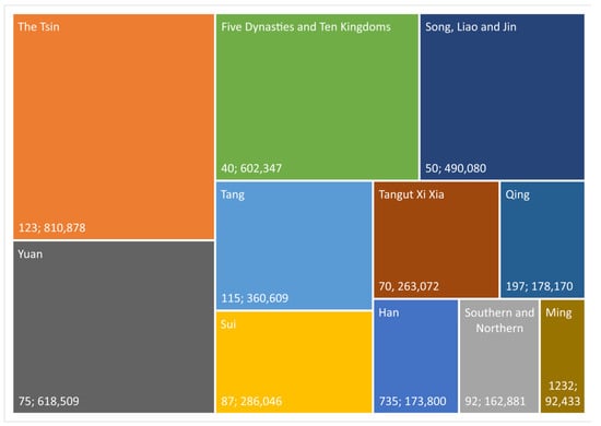 The changes in the area and quantity of military defense sites can effectively measure their strength during a certain period. Therefore, this paper calculates and presents statistics on the average area and number of military sites constructed in each period (the chronology of each dynasty can be found in the Supplementary Manual: Chronology of Dynasties) (Figure 3). The results show that the Han and Ming had the largest number of military defense facilities among all dynasties. In particular, the construction intensity of military defense facilities in the Ming Dynasty reached its peak, followed by the Wei, Tsin, Tang, and Qing Dynasties. These sites were classified together as another category, where the number of constructions remained between 100 and 200. The Southern and Northern Dynasties, Sui Dynasty, Five Dynasties and Ten Kingdoms, Song, Liao, and Jin Dynasties, Xixia Period, and Yuan Dynasty are the third category, and the number of constructions is small (n < 100). So, at this time, construction was at a low ebb. To understand this fluctuation, the strength and length of the existence of the dynasty should be considered. The Han and Ming Dynasties were the two most prosperous dynasties in Chinese history. They had sufficient national strength and time to engage in construction work. The Song, Liao, and Jin Dynasties and the Xixia Period saw many challenges, such as national power decline, civil strife, and instability compared to the Wei, Tsin, Sui, and Southern and Northern Dynasties and the Five Dynasties and Ten Kingdoms. The continuous development of major defense projects was difficult to maintain. The military defense system has been built. However, the results are not significant. Furthermore, the changes in rulers’ ideas and the country will mean that although the Tang and Qing Dynasties had sufficient time and strength, they were not eager to construct military defense facilities.