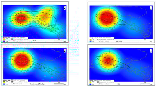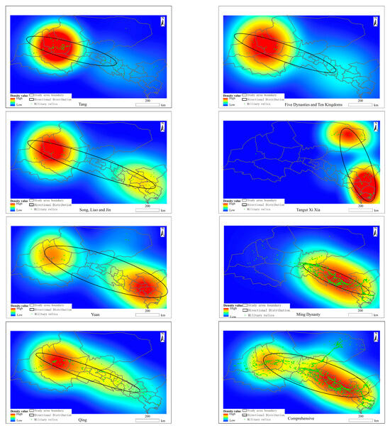 Figure 4 shows the results obtained using Kernel density to accurately describe the spatial layout characteristics of elements of military defense facilities and analyze differences and trends. The circle in the figure represented the standard deviation ellipse result, which reflected the spatial concentration or dispersion directionality of the site. The smaller the circle, the more concentrated it is.