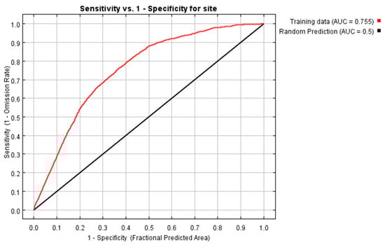 As a critical area, differences are evident in the distribution of the military defense system in the Hexi Corridor. These variations reflect the difference in fortification levels in the area. Such differences are of great significance for an in-depth understanding of the military defense strategy in this region. Therefore, an accurate model should be based on the environmental variable information related to military defense facilities (soil, vegetation, and landform types, section curvature, altitude, slope, slope aspect, and distance from the Silk Road’s main line). The Maxent model simulates the ideal area for the construction of military defense facilities used as the fortification level. Figure 5 displays the simulation. Figure 6 shows the AUC curve of the simulation results, with a gain value of 0.755 > 0.6 (significant value). The gain value demonstrates that the simulation results were credible.