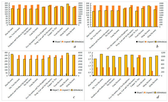 Statistical results of topographic factors affecting the distribution of archaeological sites in different periods. The vertical axis on the right represents altitude, where (a) is the average value of each factor, (b) is the median, (c) is the maximum value, and (d) is the minimum value.
