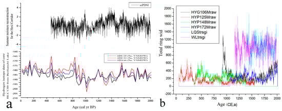 The climate change process in the Hexi Corridor in the past 2000 years. (a) is the early summer drought index in the Hexi Corridor in the past 1500 years and the index of glycerol dialkyl glyceride tetraethers (GDGTs) in the sediments of the Beilian Pool on the west side of the Hexi Corridor; (b) refers to the change in tree-ring width in Qilian Mountains, Qinghai.