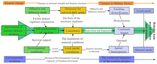 The decrease in land productivity due to temperature decrease during the cold period caused a shortage of resources [60]. Under this ecological pressure and social conditions, a peak period of war and unrest on a national scale followed [66]. The vegetation type statistics of the site distribution also show that the proportion of cold resistant cultivated crops reached its peak during the period of political instability (32.5% in the Five Dynasties and Ten Kingdoms and 30.6% in the Yuan Dynasty), which may reflect the ecological pressure and food security needs caused by war. In many cases, it eventually leads to the demise of a dynasty and the establishment of a new one. Therefore, in Chinese history’s dynastic cycles, with their alternating chaos and order, climate fluctuations were decisive [67,68]. Climate fluctuates violently or turns unfavorable, which becomes a critical node of dynastic change [69]. The apparent impact of this climate change in the northern region was the southward movement of the northern peoples [17,51,70]. These incursions forced the Central Plains Dynasty to build a permanent military defense system in the boundary zone between nomadic and farming civilizations. Therefore, war was the direct cause of building the northern military defense system. The fundamental driving force is its environmental changes was dominated by shifting climate conditions [71,72].