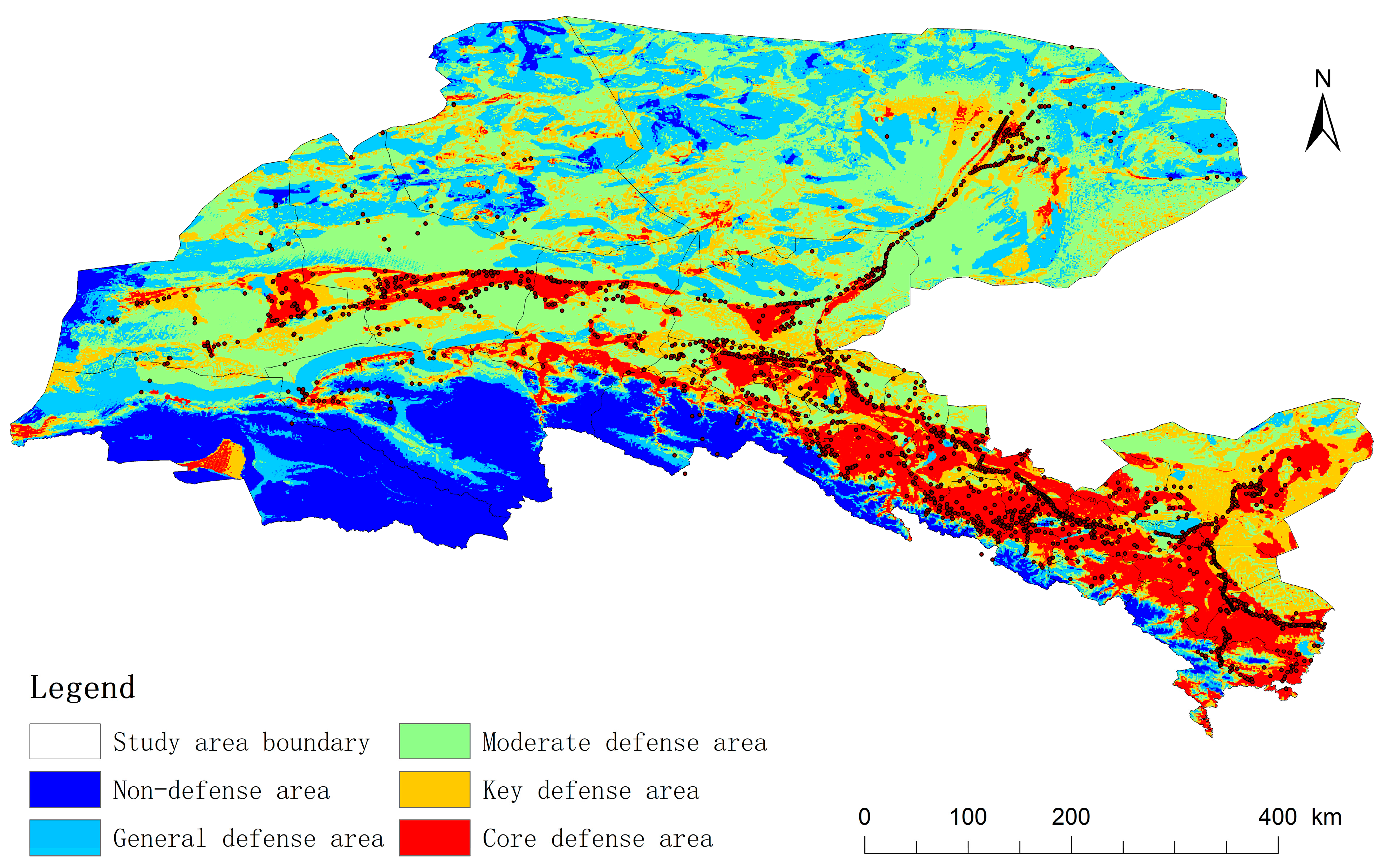 3.3. Division of Military Defense Levels in the Hexi Corridor