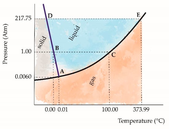Phase diagram of water. A: triple point; B: melting point; C: boiling point; D: critical pressure; E: critical point.