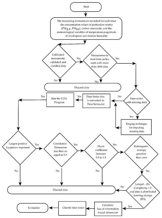 It is common that in the ordered pairs that make up the data sequence of the time series, there are missing measurement discrepancies. This happens, for example, due to an electrical fault, a defect in the measuring equipment, etc. The missing data in a series were completed using the Kriging technique [] (this is indicated in the flowchart in Figure 4). Figure 4 is a flowchart showing the process followed to apply chaotic analysis software (CDA) [] to time series.