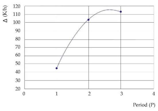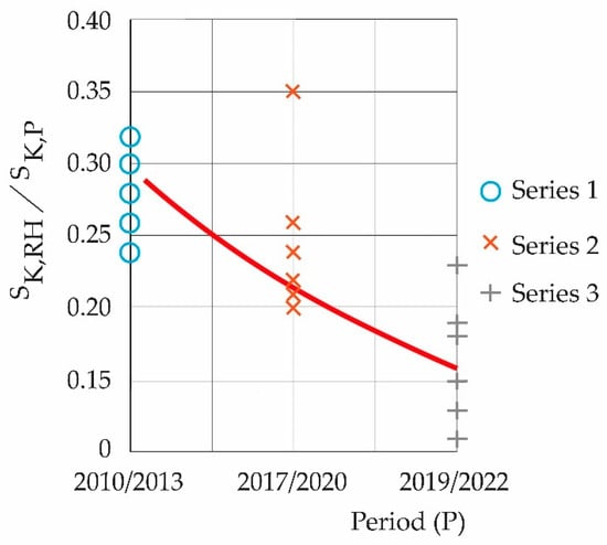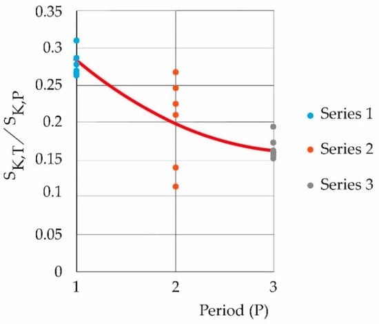 From Table 6, Figure 5 is constructed. Figure 5 shows the decay, according to the periods studied, of the quotient between the maximum entropy of relative humidity and the maximum entropies of the pollutants symbolically, SK,HR/SK,P.