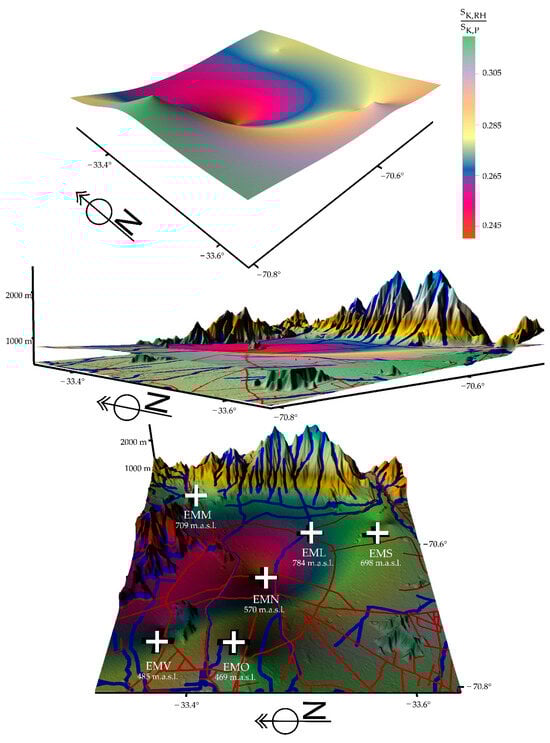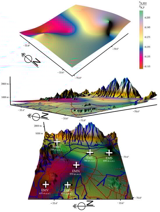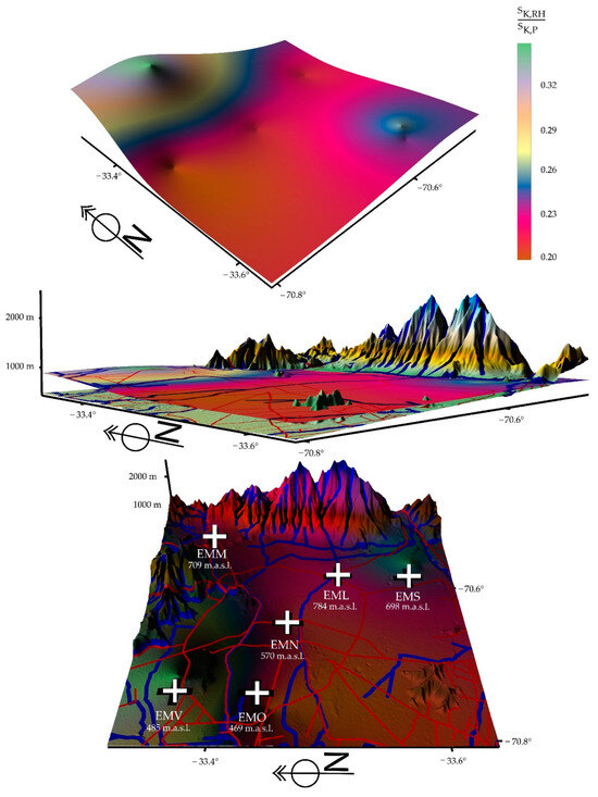 For this purpose, the measuring instruments were located at a height between 4 and 10 m (from the ground) depending on the communes. Each commune was treated, in a first approximation, as an island up to a radius of 5 km. Each of the three measurement periods covered 3.25 years, and the measurement periods were 2010/2013, 2017/2020, and 2019/2022. In each of the six commons studied, three urban meteorological variables (temperature (T), wind speed magnitude (WS), and relative humidity (RH)) and three atmospheric pollutant variables (10 µm particulate matter (PM10), 2.5 µm particulate matter (PM2.5), and carbon monoxide (CO)) were measured as hourly time series. This gives a total of 36 time series containing 1,024,668 data for each period. In total, 3,074,004 data were involved in the three periods. The measurement area corresponds to 641 km2 and is subject to increasing processes of intensive high-rise construction, population growth that currently borders on 7,500,000 (data recording area), polluting vehicles, built-up area, reduction of agricultural areas and green areas, drought, low relative humidity, piping and channeling of water courses, etc. Through chaos theory, the chaotic parameters are calculated for each time series: λ (Lyapunov coefficient) > 0, 0 < DC (correlation dimension) < 5, SK (Kolmogorov entropy) > 0, 0.5 < H (Hurst coefficient) < 1, LZ (Lempel–Ziv complexity) > 0, D (fractal dimension) > 0, <ΔI> (information loss) < 0, demonstrating that the 108 time series are chaotic. From the Kolmogorov entropy, calculated for the time series, the quotient is constructed between the sum of the Kolmogorov entropies of the relative humidity (of each commune and for each period) and the sum of the Kolmogorov entropies of the pollutants (of each commune and for each period), SK,RH/SK,P (same procedure for temperature), which allows us to show the following in a relatively simple way: