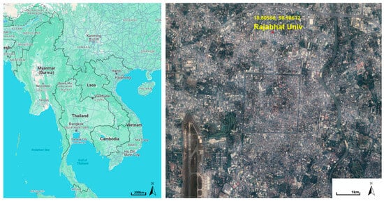 Air sampling took place on the fourth-floor terrace of Rajabhat University, situated in the heart of Chiang Mai’s urban area (Figure 1). The university is surrounded by a mix of commercial districts, residential neighborhoods, and major roadways, providing a comprehensive representation of the city’s ambient air quality. The elevated sampling location minimizes direct interference from immediate roadside emissions, ensuring that the collected samples reflect the general urban background conditions influenced by typical urban activities and regional pollutant transport []. For the collection of VOCs, samples were collected continuously for 24 h during the first week and during daylight hours from 9 a.m. to 9 p.m. in the second week. VOC sampling was continuously conducted for 24 h per day, allowing us to capture both daytime and nighttime VOC variations. This provided valuable insights into diurnal patterns, including potential nocturnal emissions and nighttime chemical processes. However, heavy overnight rainfall occurred at the end of the first week, causing equipment instability and raising concerns about data quality. Therefore, VOC sampling during the first week was conducted continuously for 24 h per day. In the second week, the sampling period was from 9 a.m. to 9 p.m. This adjustment was taken into account specifically on daytime photochemical processes, which are particularly important during the biomass burning season, while ensuring a more stable instrument operation and data quality control.