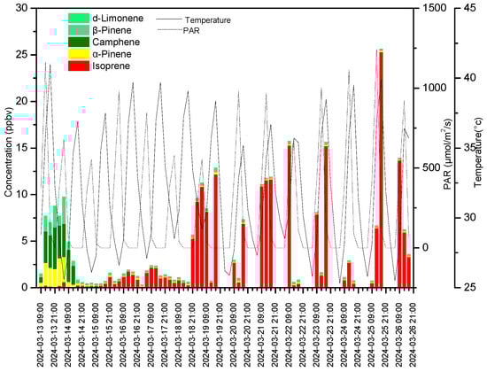 Throughout the sampling period, photosynthetically active radiation (PAR) was measured every 30 min using a PAR sensor (MQ-200; Apogee Instruments, Logan, UT, USA) placed in an area without shade, close to the air sampler. Additionally, meteorological data, including temperature and wind, were obtained from the Thailand Pollution Control Department (PCD). The VOCs concentrations were normalized to account for temperature variations.