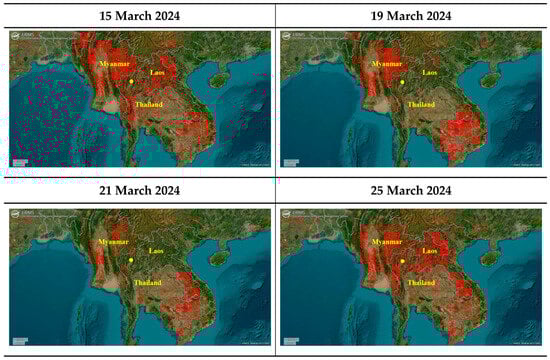 During the episode period, Thailand, particularly Chiang Mai, experienced some of the highest concentrations of PM2.5, often exceeding 200 µg/m3 []. Chiang Mai, located in northern Thailand, borders Myanmar and Laos. From February to April, biomass burning is usually prevalent across northern Thailand, Myanmar, and Laos. The dry climate further exacerbates the situation, with frequent wildfires and the common practice of burning agricultural residues for land clearing [,,,,,]. Chiang Mai’s geographical location in a valley surrounded by mountains contributes to the accumulation of air pollutants, as the topography traps polluted air and prevents its dispersion, resulting in severe air pollution [,]. Furthermore, during this period, fine particles and other pollutants from biomass burning in Southeast Asia can travel across borders and even across oceans, impacting extensive regions [,,]. This can cause adverse effects on human health and ecosystems.