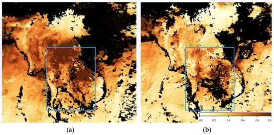 Aerosol optical depth (AOD) for the periods (a) 14–21 March 2024 and (b) 22–29 March 2024. The blue box indicates Thailand and its surrounding areas. (Source: NASA Earth Observations.)