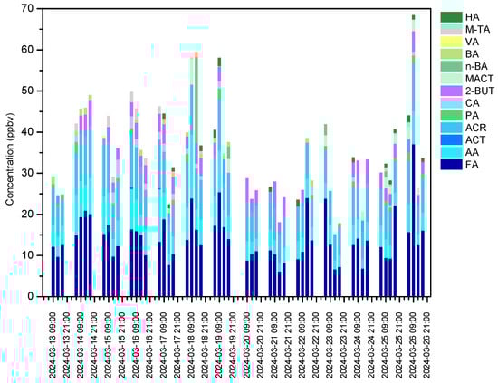 A notable observation was that n-BA, which was not detected at all, was detected at over 20 ppbv only during the period from 9 a.m. to 1 p.m. on 18 March. n-BA can be produced from the incomplete combustion of fuels, and its presence in high concentrations on 18 March may be attributed to severe biomass burning and northeast winds on that day. Meanwhile, at the same time on 26 March, FA was detected at a very high concentration of 37.07 ppbv. This may be related to a significant spike in isoprene concentration, which surged to around 25 ppbv the previous evening because isoprene is a precursor of FA [,]. In addition, biomass burning and broadleaf vegetation, which are common sources of both FA and isoprene, are likely responsible.