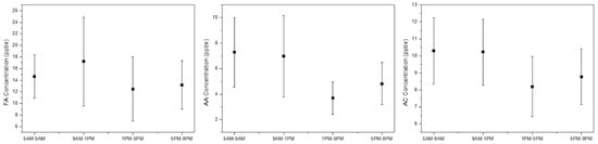 The diurnal patterns of the most frequently detected carbonyl compounds—formaldehyde (FA), acetaldehyde (AA), and acrolein (AC)—are illustrated (Figure 7). All showed a common pattern of decreasing from 1 p.m. to 5 p.m. and increasing from 5 p.m. to 9 p.m. During this time, solar radiation intensity peaked, leading to increased production of ozone and hydroxyl radicals (OH) in the atmosphere. Carbonyl compounds can react with these radicals, being broken down into smaller molecules. The reaction rates of these carbonyl compounds with OH radicals are known to be fast. For instance, the reaction rate coefficient of acetaldehyde at 25 °C has been reported to be (1.45 ± 0.25) × 10⁻11 cm3 molecule⁻1 s⁻1 []. The high concentrations of OH radicals during peak sunlight hours likely result in the photochemical breakdown of carbonyl compounds, contributing to their lower concentrations during the daytime.