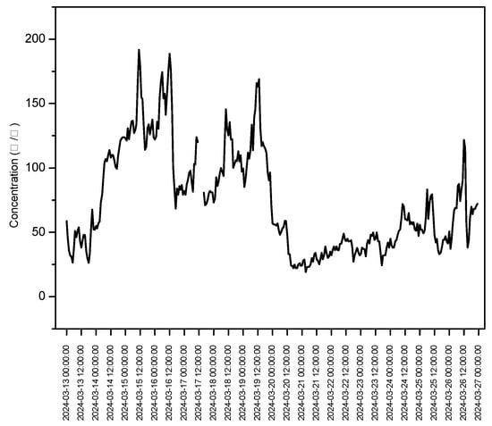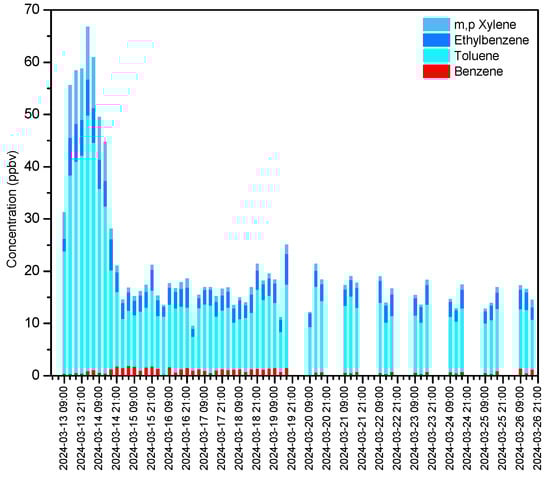 The total concentration of BTEX ranged from 9.57 to 66.57 ppbv (Figure 8). Toluene consistently had the highest proportion among the BTEX compounds, with concentrations approaching 50 ppbv on 14 March before rapidly declining to levels between 6.49 and 16.38 ppbv. Xylene ranged from 0.23 to 10.27 ppbv, initially showing higher concentrations than ethylbenzene but decreasing over time. Benzene, with concentrations ranging from 0.21 to 1.88 ppbv, had the smallest proportion. Compared to roadside locations in Bangkok and Udon Thani, where traffic emissions are a significant factor, the concentration was relatively low [,]. In contrast, our measurements were taken from the terrace of the 4th floor of the school, away from direct traffic sources, which likely resulted in lower concentrations. Ref. [] reported that the benzene concentration at Chiang Mai City Hall and Yupparaj Wittayalai School was 0.7 ppb and 1.0 ppb, respectively. These results suggest that benzene concentrations observed at non-roadside locations, such as the city hall and schools, were consistent with the findings of this study.