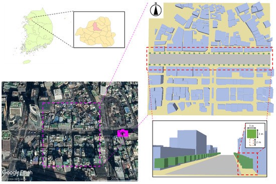 The study area is located in Jongno-gu (37.569–37.571° N, 126.984–126.987° E), one of the central business districts in Seoul, Republic of Korea. This area is known for its high pollutant concentrations among the key urban districts in Seoul [38,39]. It is a high-pedestrian-traffic area due to the presence of office buildings, major tourist attractions, parks, and traditional markets. Additionally, an average of approximately 45,000 vehicles passes through this area daily on weekdays, indicating high vehicular traffic from the Seoul Transportation Operation and Information Service (TOPIS) [40]. The average building height in the area is 7 m, but buildings along the roadside range from approximately 3 to 28 m in height (Figure 1). The trees in the area were planted in a single row along the road edges, spaced approximately 3 to 10 m apart from the neighboring ones.