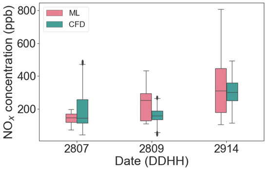 To verify the effectiveness of the CFD model, the NOx concentrations measured via the ML in the study area were compared with the CFD model results using a box plot (Figure 2). The CFD model results in the noAero_noDep scenario were used for validation. The CFD model results considered the area measured via the ML, specifically the road segments (x-axis: 0–300 m; y-axis: 134–162 m (Figure 3)) and at a height of 1.5 m. At 07:00 on 28 January, the CFD model results showed greater variability than the ML measurements, but the median values of the ML measurements and the CFD model results were similar, at 148.8 ppb and 144.8 ppb, respectively. At 09:00 on 28 January, the CFD model exhibited a slightly underestimated distribution compared to the other dates. The median values were 267.3 ppb for the ML measurements and 159.2 ppb for the CFD model results. At 14:00 on 29 January, the ML measurements showed greater variabilities than the CFD model results, but their median values were similar to each other, at 307.2 ppb and 301.2 ppb, respectively. While the CFD model tended to slightly underestimate NOx concentrations, it still provided a reasonable simulation of the NOx concentrations in the study area. The slight discrepancy between the field measurements and CFD model results might be attributed to differences in traffic volumes between the area where the traffic was recorded and the modeling area. In this study, the traffic volumes in the study area were quantified by converting a traffic count from a 5 min video recording into an hourly traffic volume rather than fully using a one-hour recording. Additionally, the absence of a chemical mechanism in the CFD model might have contributed to some uncertainties. Nevertheless, the CFD model reasonably captured the NOx concentration patterns within the study area.