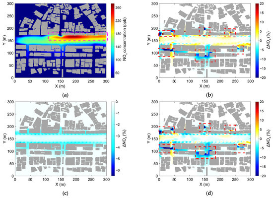 High NOx concentration areas in the study area appeared at 150–200 m relative to the x-axis and 150–160 m relative to the y-axis (pink rectangle) (Figure 3a). This location showed high concentration regions in some road and sidewalk segments due to the structural impact of dense buildings. When only the aerodynamic effect of trees was applied, ΔNOx decreased and increased in certain road and sidewalk segments. The areas with decreased and increased ΔNOx were formed behind buildings along the roadside (red rectangles) rather than directly on the road or sidewalk segments (Figure 3b). When only the dry deposition effect of trees was considered, the ΔNOx distribution showed negative ΔNOx values across both the road and sidewalk segments, indicating a reduction in NOx concentration (Figure 3c). When both the aerodynamic and dry deposition effects of trees were applied, the highest and lowest ΔNOx distributions were similar to those observed when only the aerodynamic effect was considered. In other words, sections behind buildings along the roadside (red rectangles) showed a similar ΔNOx pattern to when only the aerodynamic effect was applied, with a large ΔNOx increase due to the aerodynamic effect (Figure 3d). Therefore, it was concluded that the aerodynamic effect of trees is a crucial factor in either increasing or decreasing NOx concentrations, which is in line with previous studies [62,63].