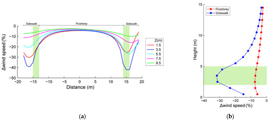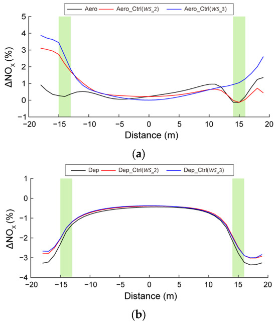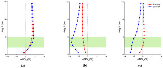 In contrast, on the roadways and sidewalks, similar patterns were not shown according to the effects of roadside trees (Figure 3c). The average ΔNOx was −0.8% on the roadways and approximately −2% on the sidewalks. This indicates that in the near-road environment, the dry deposition effect of trees had a greater impact on the NOx concentration than was the case with the aerodynamic effect. Thus, to examine the influence of both tree effects on ΔNOx, the horizontal and vertical profiles need to be further analyzed.