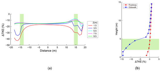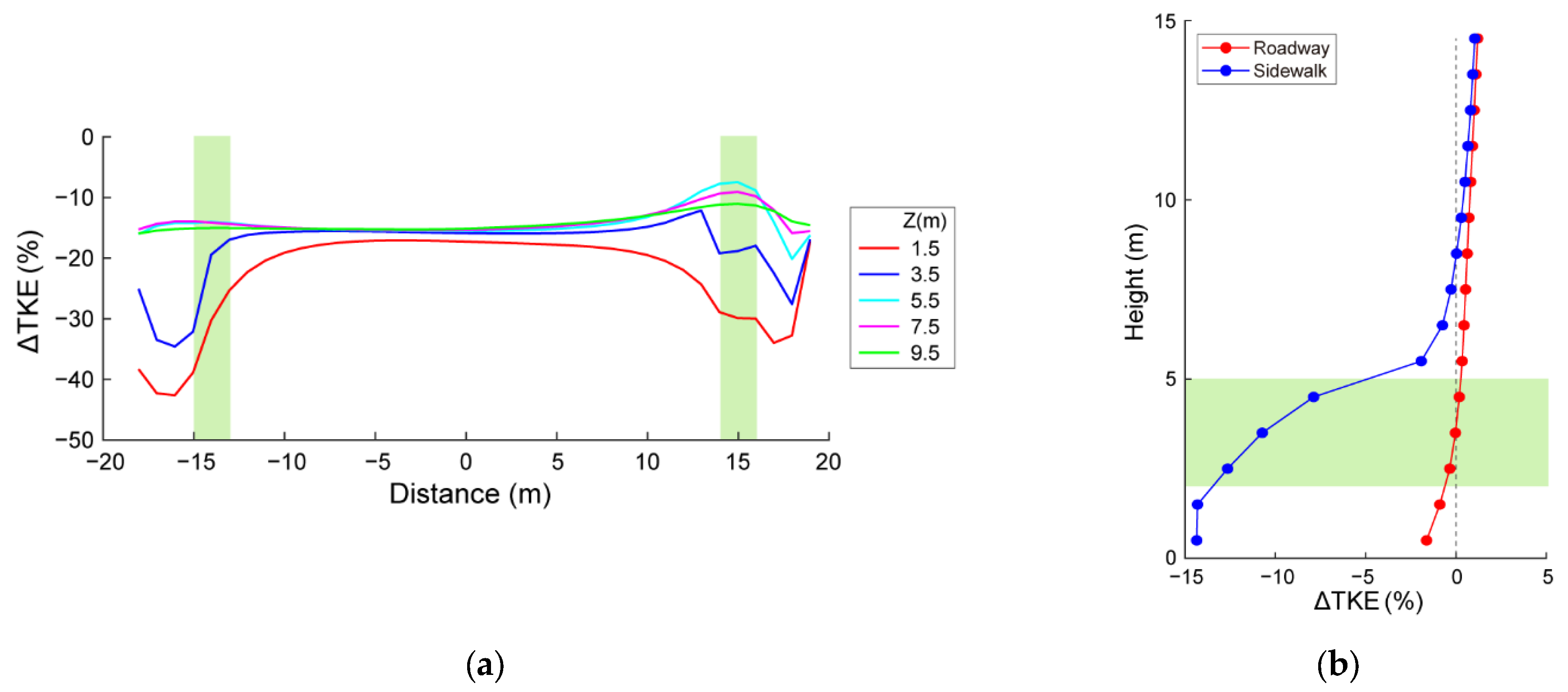 To analyze the impact of trees on NOx dispersion in the study area, ΔWindspeed ΔTKE values were calculated for a 20 m section from the center of the road (Figure 4a and Figure 5a). Figure 4a and Figure 5a show the horizontal ΔWindspeed and ΔTKE profiles at heights of 1.5, 3.5, 5.5, 7.5, and 9.5 m. The ΔWindspeed and ΔTKE values due to the presence of trees had a greater effect on the sidewalk segment than on the roadway segment. Figure 4b and Figure 5b show the vertical ΔWindspeed and ΔTKE profiles in both the roadway and sidewalk segments. Significant variations were observed at a tree canopy center height of 3.5 m, with the lowest ΔWindspeed variations observed in the sidewalk segment (e.g., ΔWindspeed of −33.5% and windspeed deviation of 0.3 m·s−1 at a height of 3.5 m) compared to the roadway segment (e.g., ΔWindspeed of −8.2% and windspeed deviation of 0.08 m·s−1 at a height of 3.5 m). The difference in ΔWindspeed and ΔTKE between the sidewalk and roadway segments exhibited a large gap from a tree canopy height up to 15 m. However, above 15 m from the ground, the difference decreased to less than −1%.