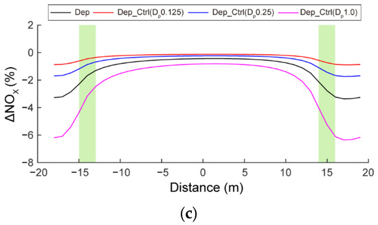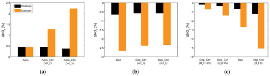 The ΔNOx resulting from the dry deposition effect of trees significantly decreased in both the roadway and sidewalk segments as the deposition velocity increased (Figure 8c). The lowest ΔNOx was observed in the Dep_Ctrl (Dp1.0) scenario, exhibiting −6.4% (i.e., −37.6 ppb) in the sidewalk segment and −2.5% (i.e., −15.1 ppb) in the roadway segment. Thus, the sensitivity of the dry deposition effect to the tree deposition velocities was proportional to the deposition velocity and was higher in the sidewalk segment than in the roadway segment.