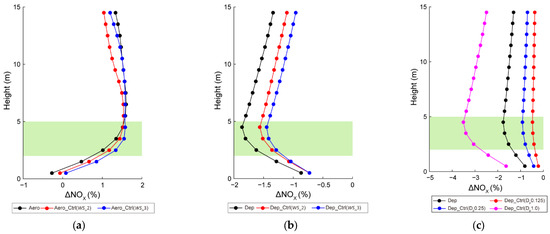 Figure 9 presents the average vertical ΔNOx profiles for the aerodynamic and dry deposition effects of trees due to changes in wind speed and for the dry deposition effect due to changes in dry deposition velocity by combining both the roadway and sidewalk segments. ΔNOx increased with the wind speed up to a tree canopy height of 4.5 m due to the aerodynamic effect of trees but decreased above that height (Figure 9a). Below the tree canopy height, ΔNOx increased with the wind speed due to the aerodynamic effect, peaking at 0.9% (about 3.8 ppb) in Aero_Ctrl () at 6.5 m before gradually decreasing above the height. The effect of the dry deposition and the change in ΔNOx with varying incoming wind speeds showed that ΔNOx increased with higher incoming wind speeds across all altitudes (Figure 9b). The difference in ΔNOx between Dep and Dep_Ctrl () below the tree canopy height ranged from 0.14% to 0.24%, which was negligible. Above the tree canopy height, the differences in ΔNOx due to wind speed became more pronounced. Thus, at heights above the tree canopy, weaker incoming wind speeds had a greater effect in reducing NOx concentrations. ΔNOx decreased proportionally as the deposition velocity of the trees increased due to the dry deposition effect of trees. ΔNOx was the lowest at the tree canopy height due to the dry deposition effect and deposition velocity, with ΔNOx at −3.5% (i.e., −14.9 ppb) in the Dep_Ctrl (Dp1.0) scenario before increasing at higher heights (Figure 9c).