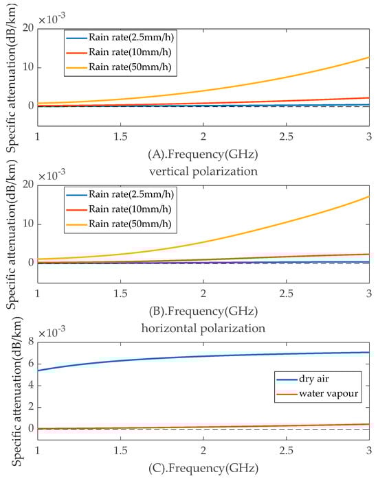 Relationship of the rain rate, air and specific attenuation. (A) Relationship of the rain rate and specific attenuation in vertical polarization. (B) Relationship of the rain rate and specific attenuation in horizontal polarization. (C) Relationship of the air and specific attenuation.