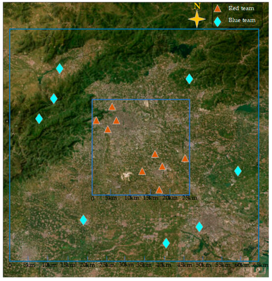 The red team defensive agents and the blue team jamming intelligent agents move in real-time, and the relative positional relationship between the communication devices and the jamming devices is illustrated in Figure 3.